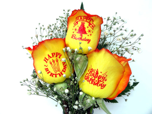 3 Rose Happy Birthday Yellow Roses with Red Tips